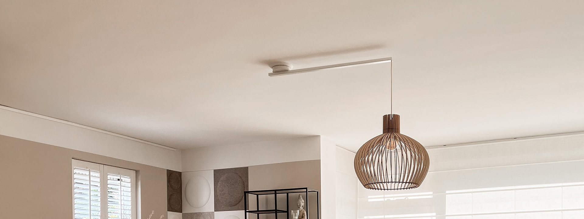 Livingroom with a Lightswing® Single white with a wooden pendant light