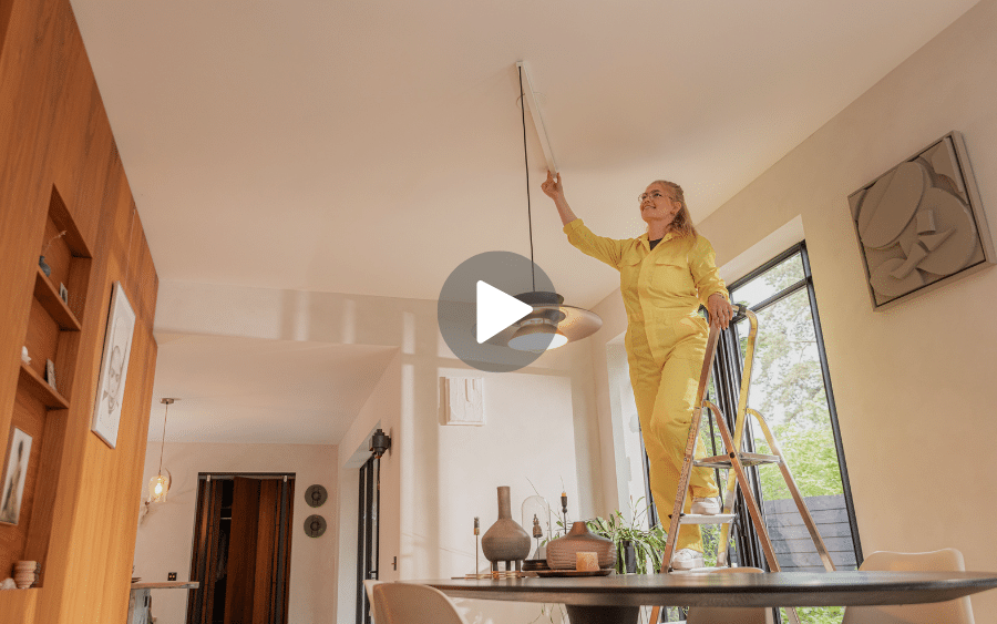 Using the provided drilling template, simply drill four holes into the ceiling. Connect the electrical wires to the terminal block of the Lightswing® and screw the Lightswing® securely to the ceiling.