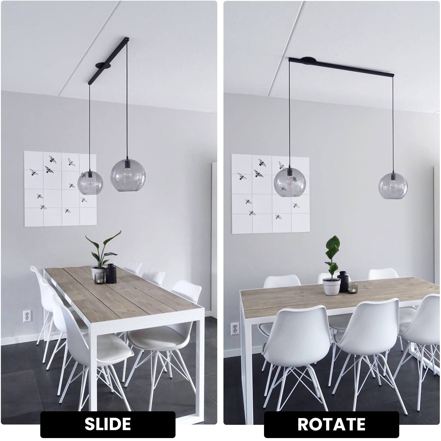 - Effortlessly slide, rotate and temporarily remove two pendant lights